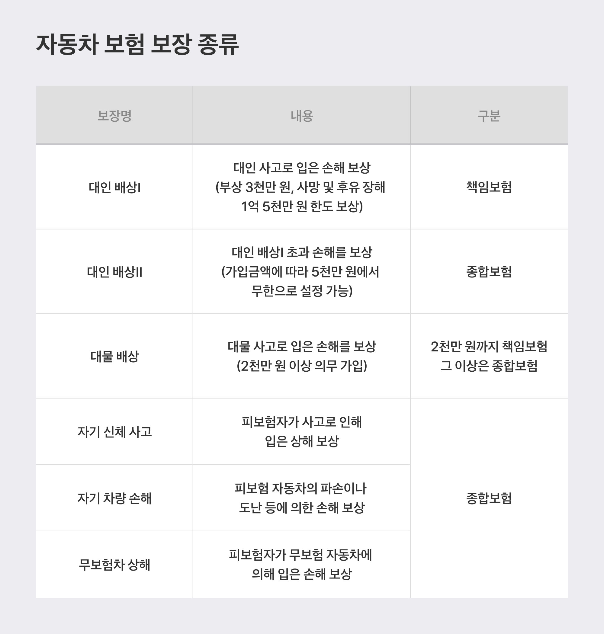 자동차 보험은 크게 ‘책임보험’과 ‘종합보험’으로 나뉩니다. 이 중 책임보험은 자동차 소유자라면 법적으로 반드시 가입해야 하는 의무보험입니다. 만약 책임보험을 가입하지 않거나 만기 후 갱신하지 않으면 과태료는 물론 1년 이하 징역 또는 1천만 원 이하의 벌금까지 부과될 수 있습니다. 책임보험은 ‘대인배상 I’과 ‘대물배상’이 포함되어 있으며, 모두 상대방의 피해를 보장하는 항목입니다. 내 차량이나 내 상해, 동승자의 피해는 포함되지 않습니다. 책임보험은 사고를 낸 사람이 보상 능력이 없을 경우 피해자가 전혀 보상받지 못하는 사태를 막기 위해 의무화된 제도입니다.